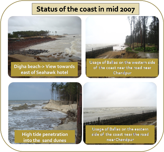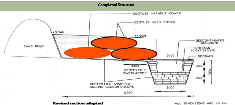 Protection measure adopting Geo-tubes as seawall for the stretch of Shankarpur along the coast of West Bengal, India has been implemented. It is the first of its kind in India & first of its kind in locations where tidal range is large (5.5m).