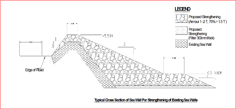 It was observed from the site visit that the existing seawall lacks filter layer, which is required to avoid scouring at the toe and also to avoid seepage. Hence it is proposed to have a filter layer of 300 mm thick. Moreover , in most of the portions the secondary armour layer is exposed , hence a primary layer consisting of armour stones of size ranging from 1-2 T with a slope of 1:3 and to a crest elevation of +5.5m.