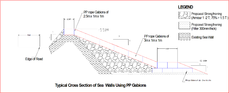 In addition to the strengthening of secondary armour layer with stones of size 1-2T ,and a filter bed of 300 mm thick ,the seawall can be further strengthened by using Gabion boxes of size 2.5mx1mx1m,filled with smaller size stones and laid at a slope of 1:3 with a crest elevation of +5.5m.The Gabion boxes will act as a primary layer and also increases the stability of the seawall against the failure due to sliding.