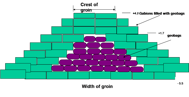 Instead of the traditional transitional groin field ,the above stretch can be protected with T-groins ,whereby the accumulation of the sand can be faster. The Transitional T-Groin field will be consisted of 11 T-groins with an average length of 200 m.